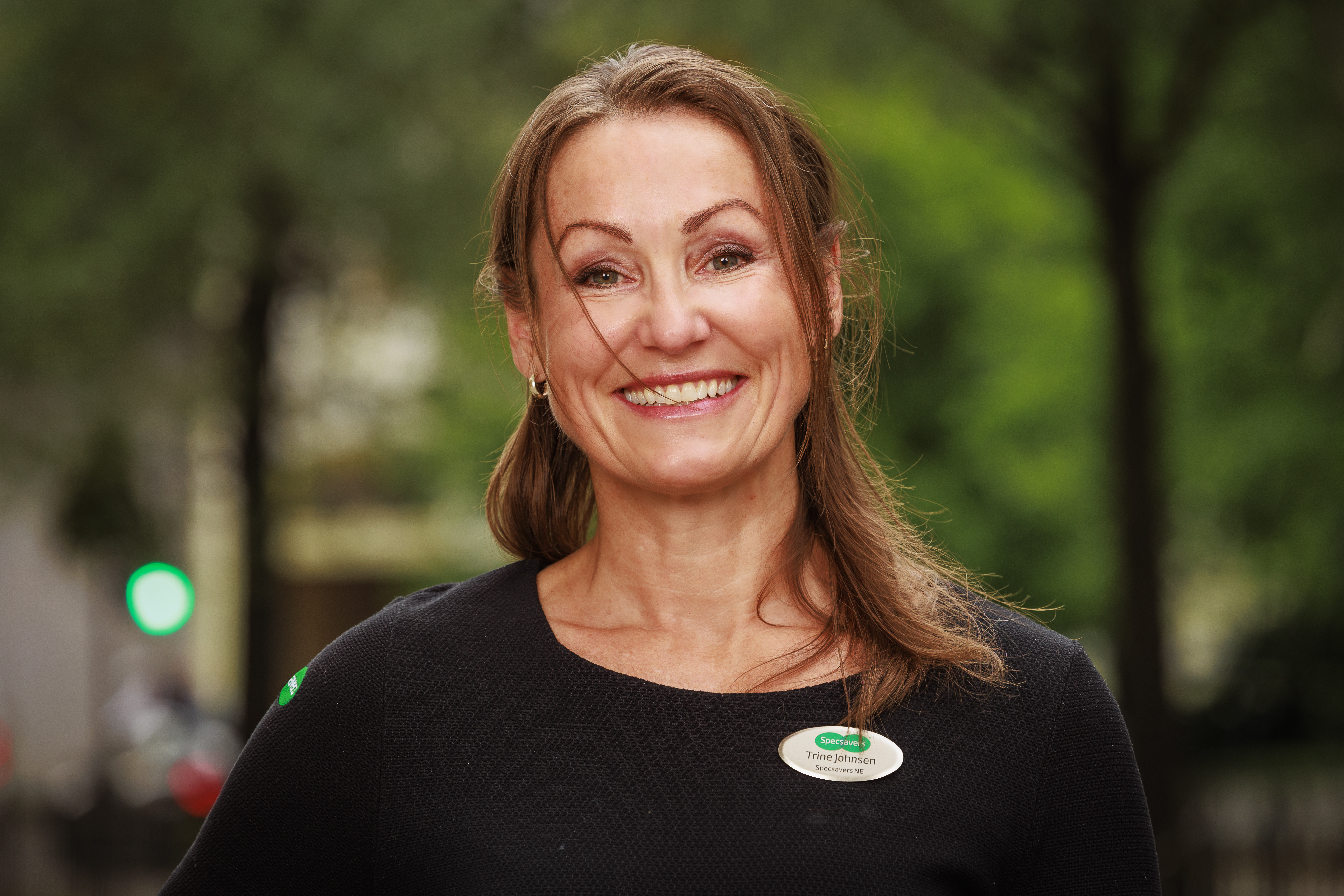 Optiker Trine Johnsen. Har på svart genser med Specsavsers-merke