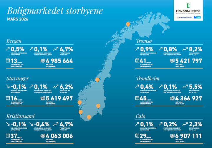 Eiendom Norges boligprisstatistikk for mars 2026 viser at boligprisene steg i alle de store byene i Norge unntatt Kristiansand og Stavanger.