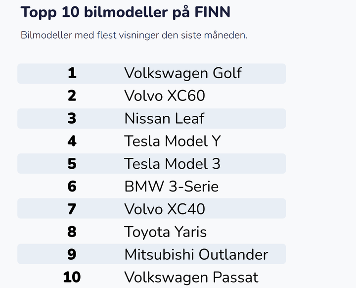 Volkswagen Golf er fortsatt modellen med flest visninger på FINN, etterfulgt av Volvo XC60 og Nissan Leaf.