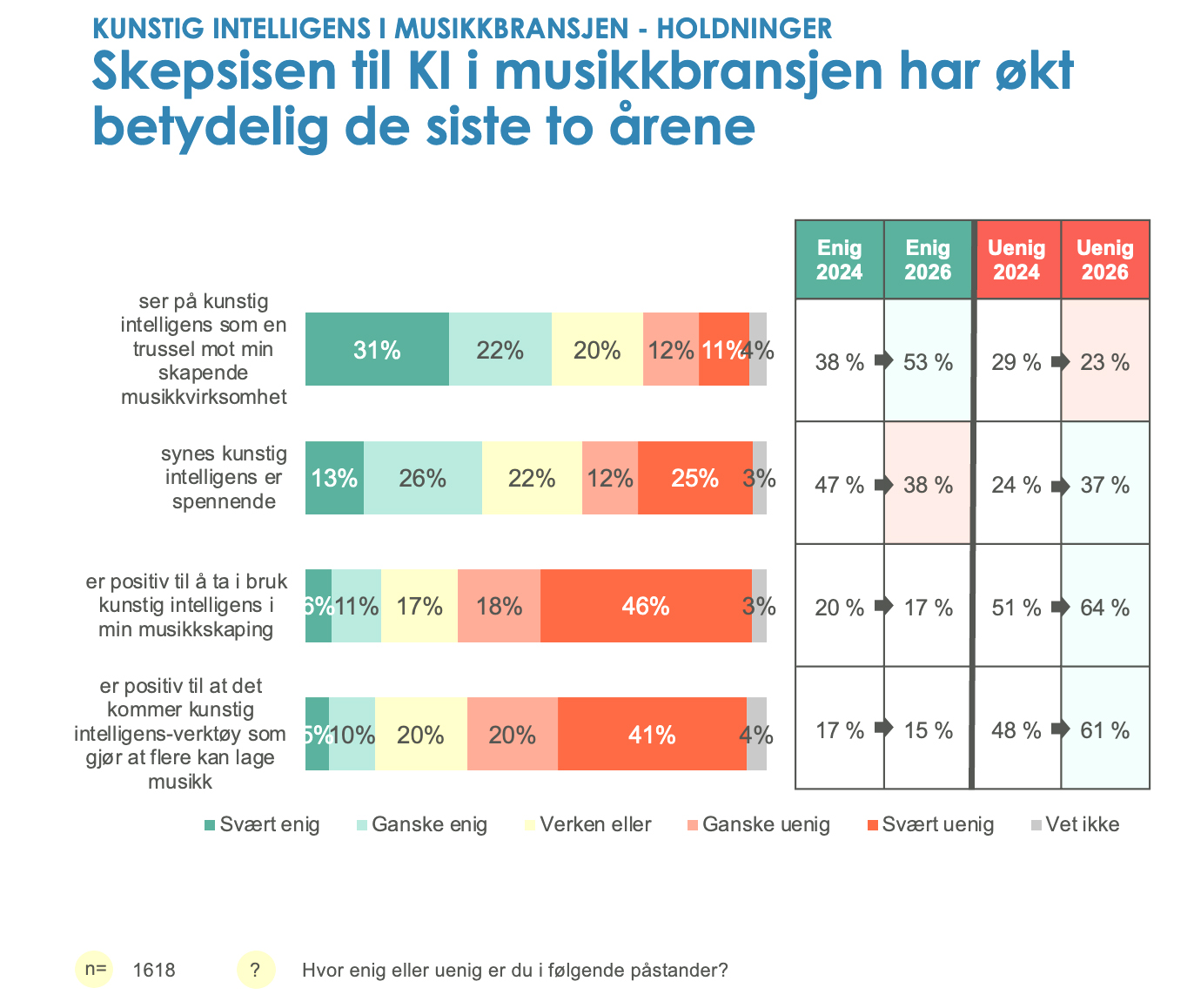• 64 % er negative til å ta i bruk KI i musikkskapingen (51 % i 2024)